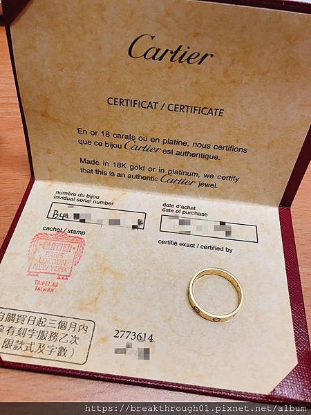 本人平常就有戴戒指的習慣,某次在朋友的洗腦下一起去看了卡地亞的戒指,後來腦波很弱的在自己生日當天買了Love系列18K黃K金給自己。