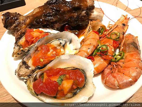 特別想推薦天使紅蝦和黑牛肋排及生蠔。紅蝦我覺蝦頭裡的那些膏狀液體真的是非常好吃,肉質品質好像不太一定,家人吃了覺還好,我個人則是應該吃了十隻以上;牛肋排爐烤香氣非常夠如果不吃牛的人我想用聞的也爽,配上有一點油花的部分表現很有水準之上,而且幾乎每條都很大一根;生蠔搭配他們特調的醬也是讓我一顆顆完全停不來,也是吃了十顆有。其他相關牛製品也都還不錯,冠軍牛肉麵我覺有點鹹,不過湯底也算是好喝。